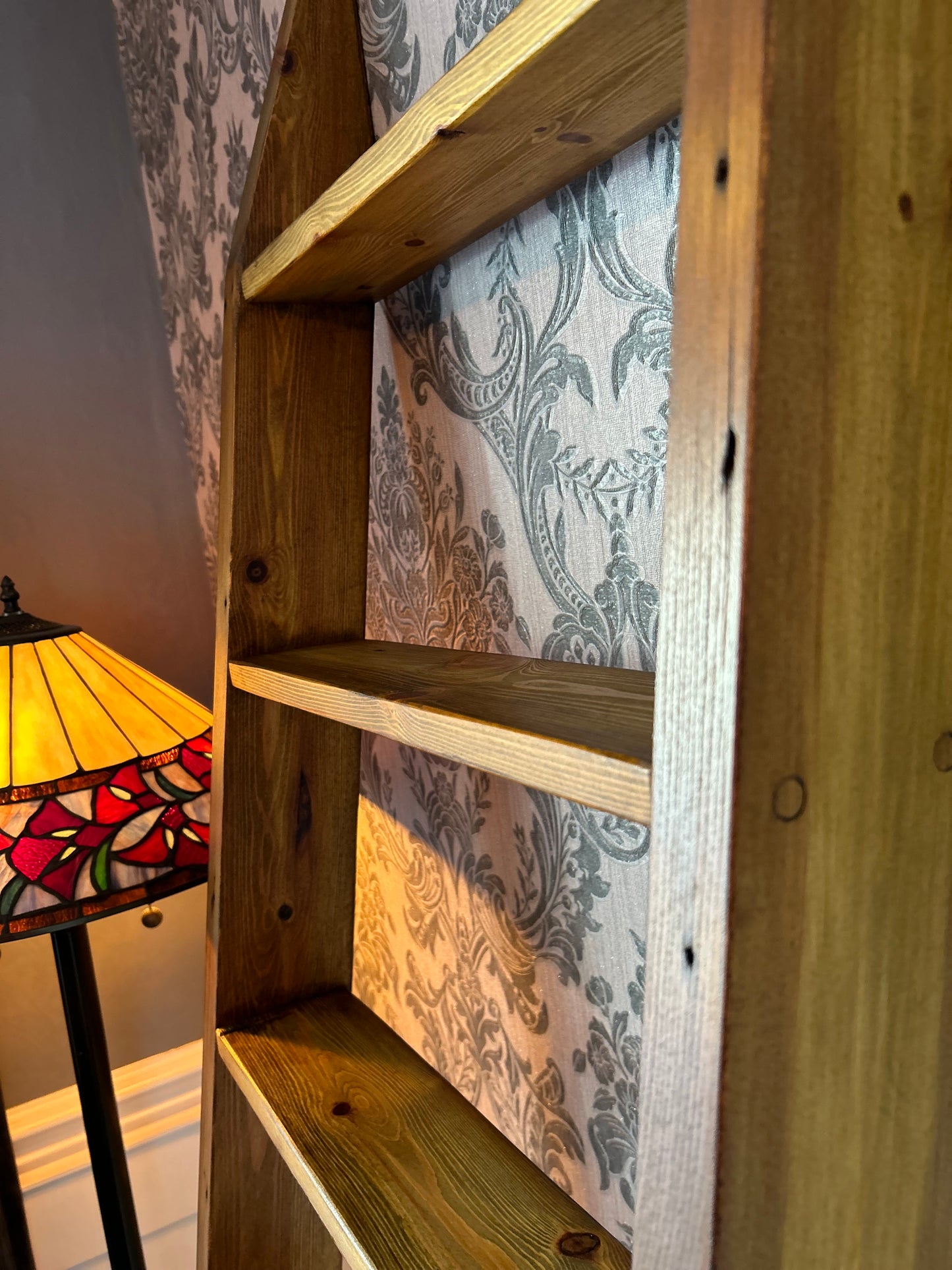 The Reclaimed Timber is sourced from salvage yards or old buildings thus - doing our bit to recycle such a lovely natural resource. All the timber we use is softwood. Reclaimed wood carries all its scars & imperfections from its previous life which may include nail holes, cuts, splits, knots and old construction marks, all adding their own character. The timber being a natural product, boasts varying grain patterns and colours ranging from pale cream-yellows to orange-browns to dark browns. Embrace the uniqueness and environmentally friendly OOAK piece of craftsmanship. The Storage Ladder is available in various wood stain colours to your choosing.